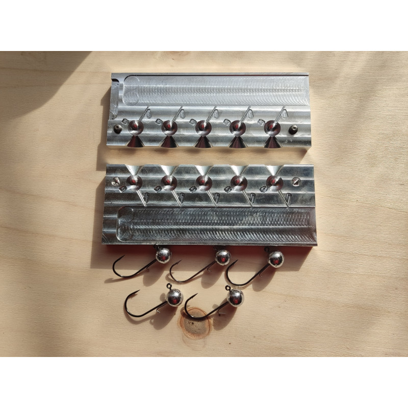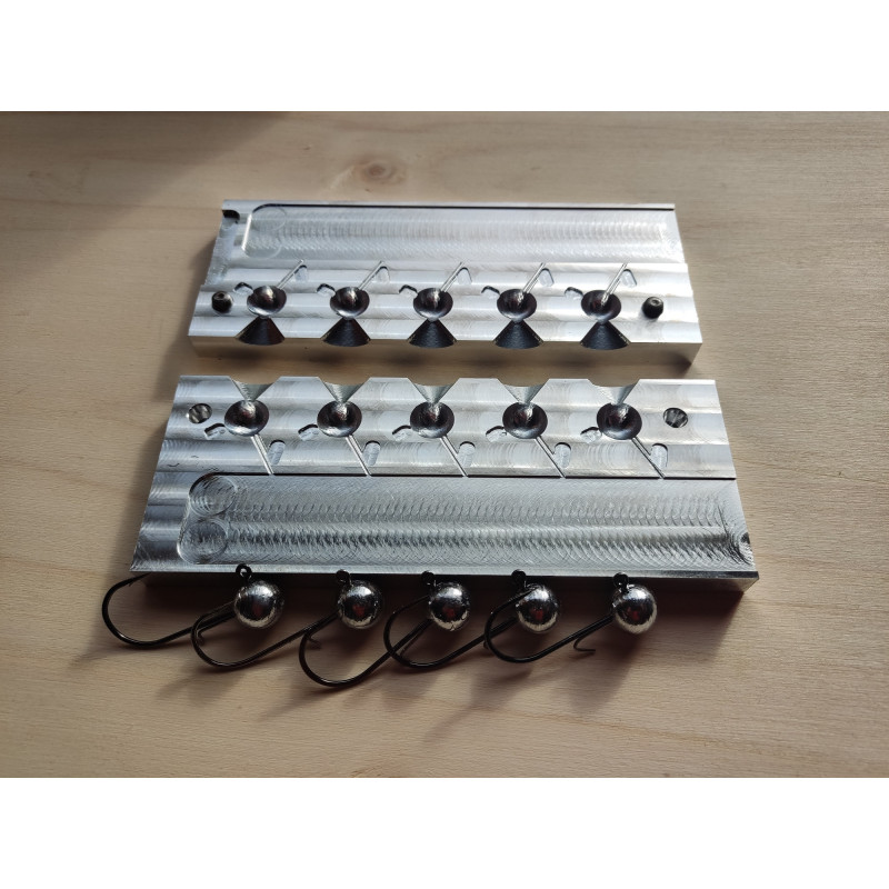 Molde de aluminio mecanizado, con dos cavidades para poteras plomadas de 12 y 22 gr aproximadamente. Varilla 1.5mm.