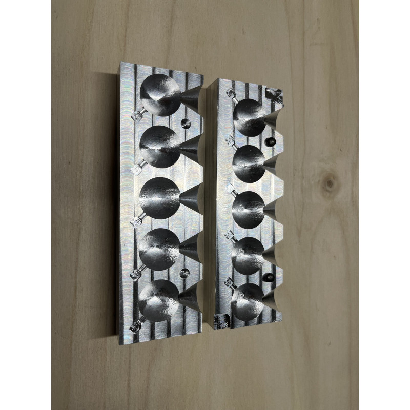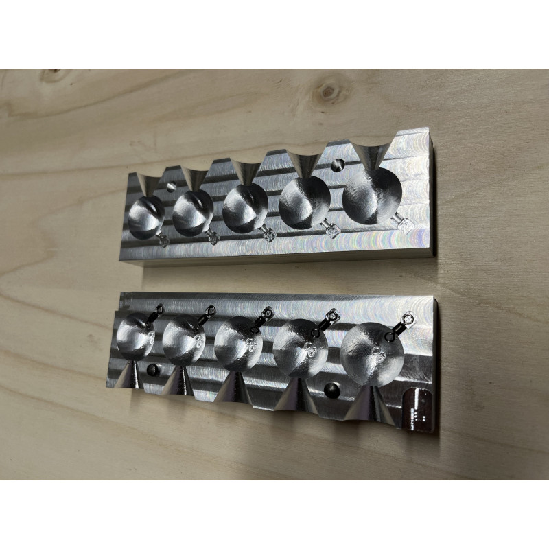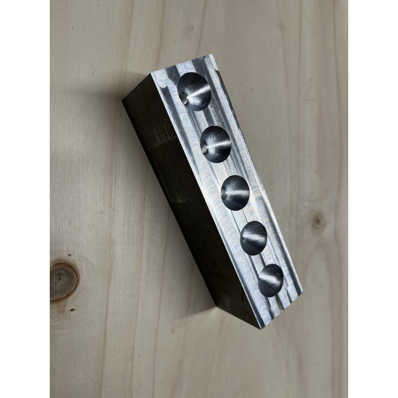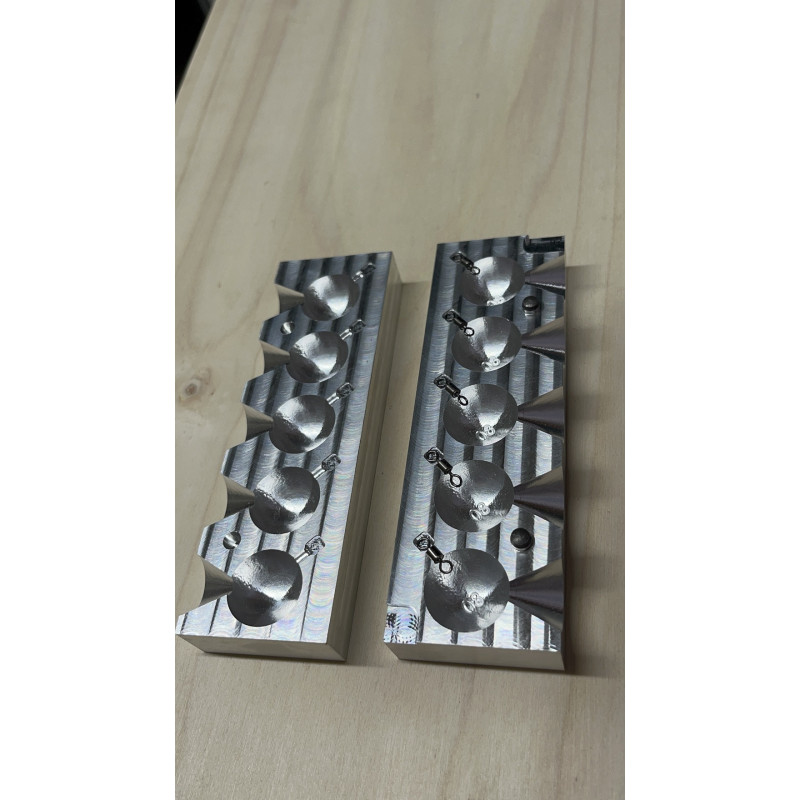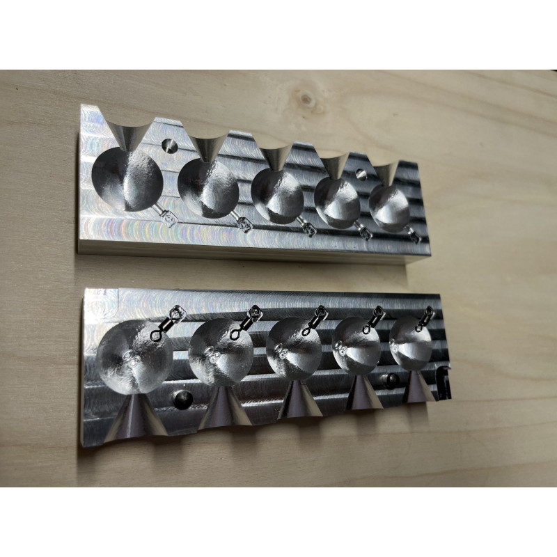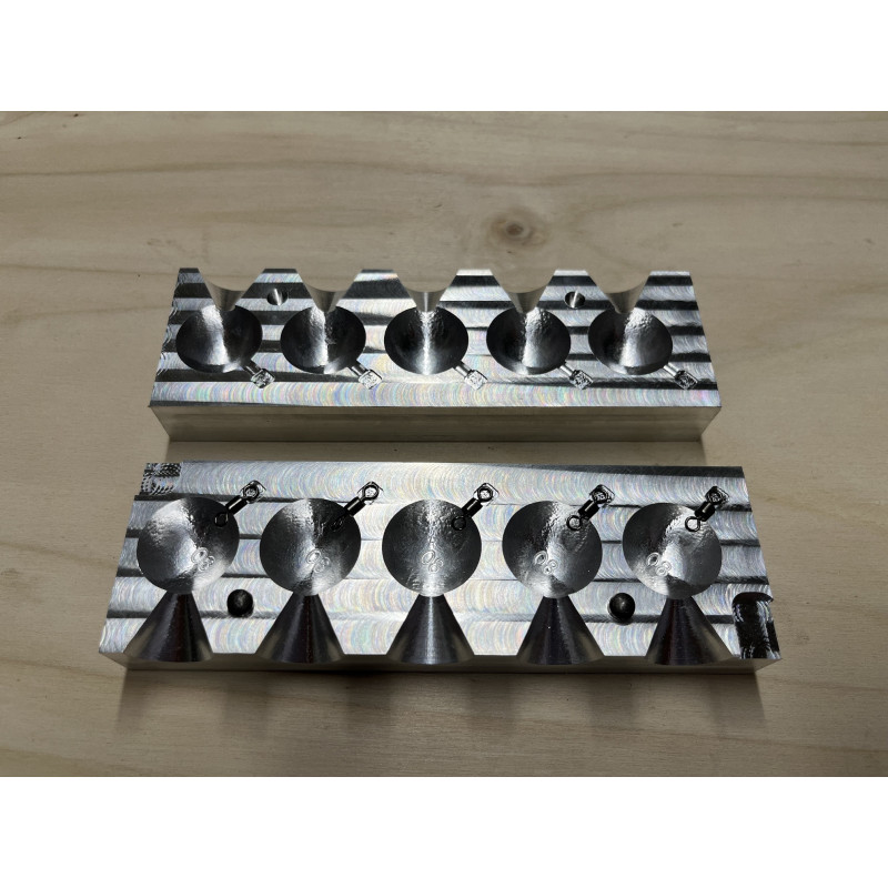 Molde de aluminio mecanizado con 5 cavidades de bolas de 80 gr aproximadamente.