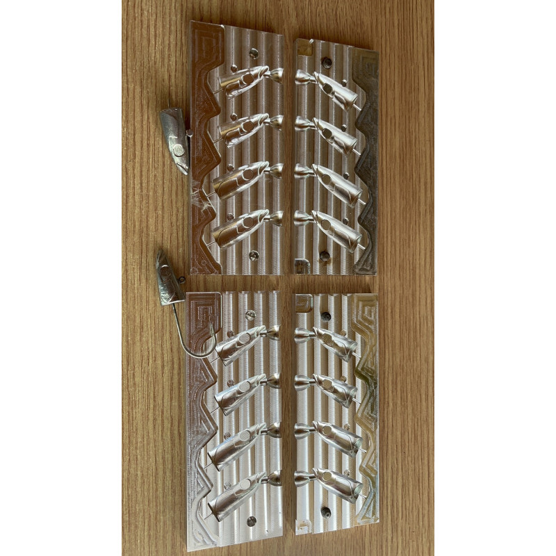 Molde mecanizado de aluminio 10 CAVIDADES, oliva 3 de 5gr, 3 de 5gr, 2 de 10gr y 2 de 19 gr aproximadamente. Varilla hasta 1,6MM.