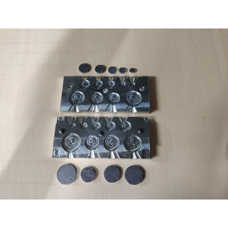 Molde aluminio mecanizado. Monedas para regular peso de las poteras con diámetros de 5 cavidades 8mm, 7 cavidades de 10mm y 5 cavidades de 12mm con espesor de 3mm y gramajes de aproximadamente 1,6gr, 2,5gr y 3,7gr.