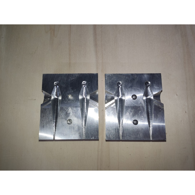 Molde de aluminio mecanizado, con dos cavidades para poteras plomadas de 15 y 18 gr aproximadamente. Varilla 1.5mm.
